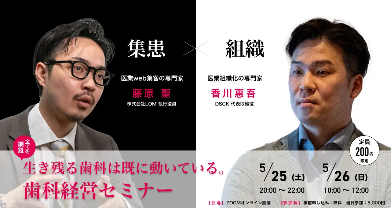 【第4回 歯科経営セミナー】生き残る歯科は既に動いている。【株式会社LOM × DSCK】 セミナー参加対象の方: 医療従事者の方 / webでの集患を伸ばしたい方 / 安定した採用体制を構築したい方 / 組織化を最適化していきたい方 第1部:集患に成功した事例をロジカルに型化再現性の高い集客方法 第2部:目的から逆算!経営視点の歯科衛生士、歯科助手採用セミナー 詳しく見る